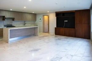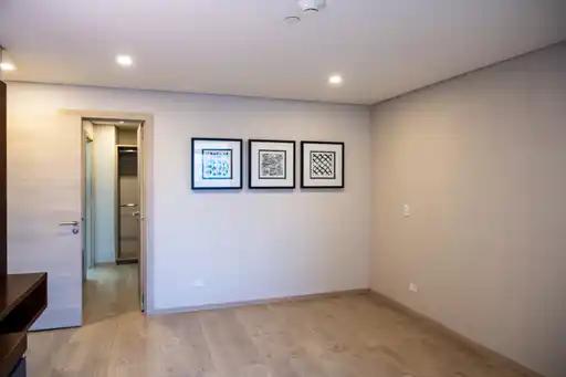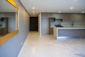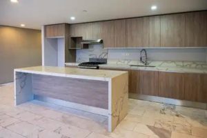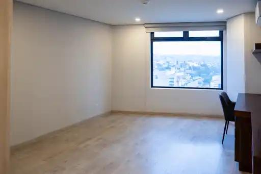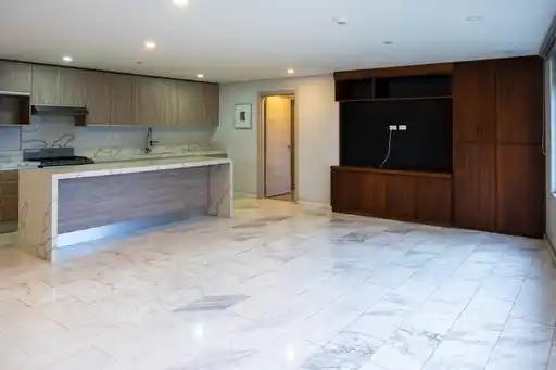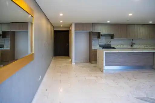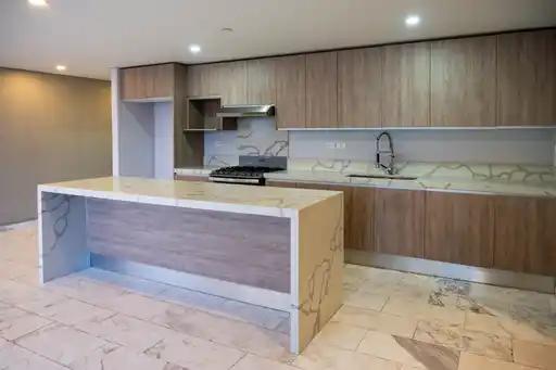 La cocina contemporánea te enamorará: isla grande cubierta de cuarzo, acabados premium y muebles empotrados. Además, disfruta de una vista espectacular hacia la ciudad y las canchas de pádel del complejo.